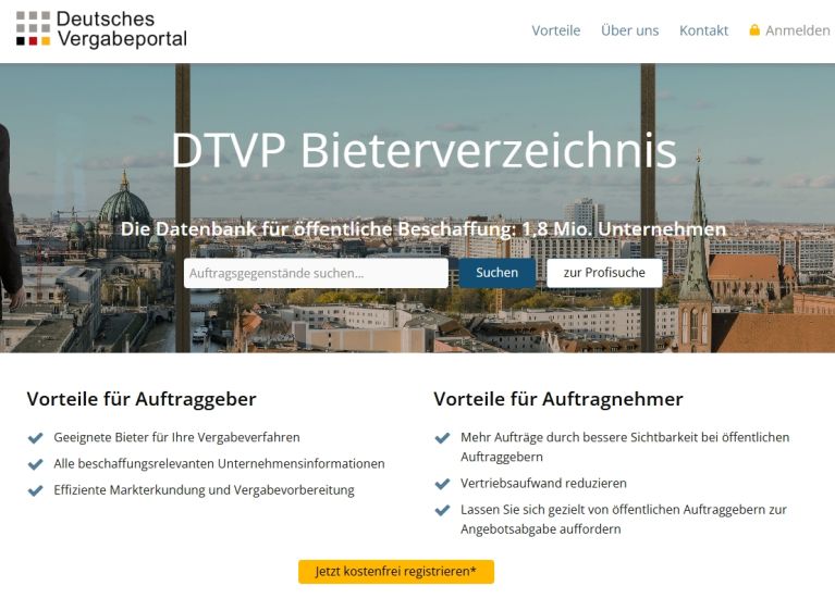 Das DTVP Bieterverzeichnis ist eine bundesweite Datenbank. Öffentliche Auftraggeber können gezielt nach geeigneten Unternehmen suchen – insbesondere für Auftragsvergaben ohne vorherige öffentliche Bekanntmachung. Unternehmen mit einem aussagekräftigen Profil erhöhen ihre Chancen, an Vergabeverfahren beteiligt zu werden oder Direktaufträge zu erhalten.